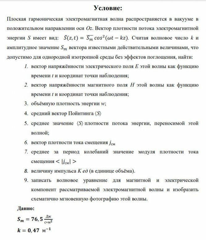 Плоская гармоническая электромагнитная волна распространяется в вакууме в положительном направлении оси Oz. Вектор плотности потока электромагнитной энергии S имеет вид: . Считая волновое число k и амплитудное значение вектора известными действительными величинами, что допустимо для однородной изотропной среды без эффектов поглощения, найти: