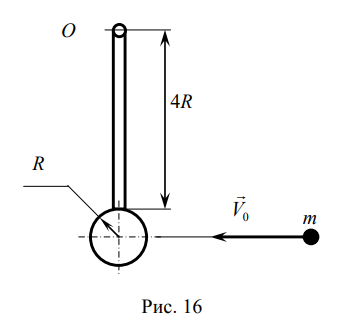 Физический маятник, состоящий из однородного шара радиусом R=3 см и массой М = 0,4 кг, жестко соединённого с однородным жёстким стержнем длиной 4R и массой M, подвешен к горизонтальной оси O, проходящей через верхний конец стержня перпендикулярно плоскости рисунка (рис.16). Маятник может свободно без трения вращаться вокруг оси O. Шарик массой m=0,05 кг движется горизонтально в плоскости рисунка со скоростью V0 вдоль горизонтальной прямой, проходящей через центр шара, и ударяет в шар. При этом взаимодействие шарика с маятником может происходить в виде: абсолютно упругого удара (АУУ); неупругого удара (НУУ); абсолютно неупругого удара (АНУУ).
