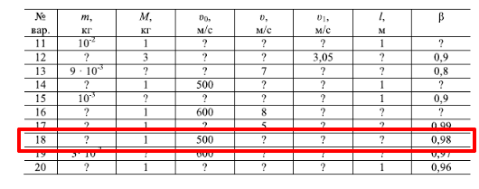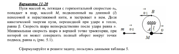 Задача 5: Пуля летящая с горизонтальной скоростью, попадает в шар, подвешенный на длинной невесомой и нерастяжимой нити вариант 18