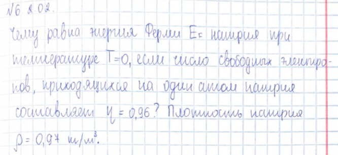 Чему равна энергия ферми EF натрия при температуре T = 0, если число свободных электронов, приходящихся на один атом натрия, составляет η = 0,96? Плотность натрия ρ = 0,97 г/см^3.