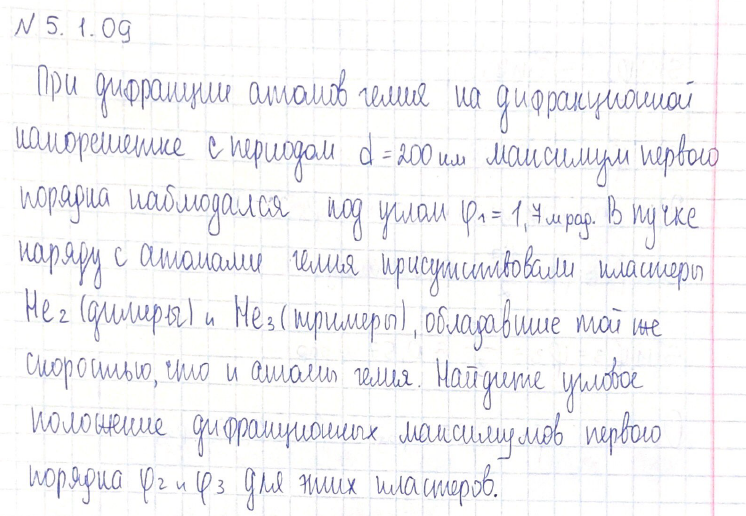 При дифракции атомов гелия на дифракционной нанорешетке с периодом d = 200нм максимум первого порядка наблюдался под углом φ = 1,7 мрад. В пучке наряду с атомами гелия присутствовали кластеры He2 (димеры) и He3 (тримеры), обладавшие той же скоростью, что и атомы гелия. Найдите угловое положение дифракционных максимумов первого порядка φ2 и φ 3 для этих кластеров.