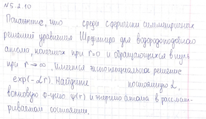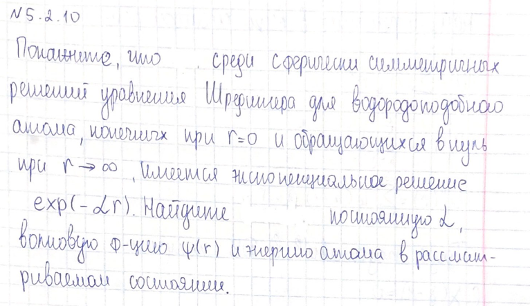 Покажите, что среди сферически симметричных решений уравнения Шредингера для водородоподобного атома, конечных при r = 0 и обращающихся в нуль при r → ∞, имеется экспоненциальное решение exp(-αr) . Найдите постоянную α , волновую функцию ψ (r) и энергию атома в рассматриваемом состоянии.