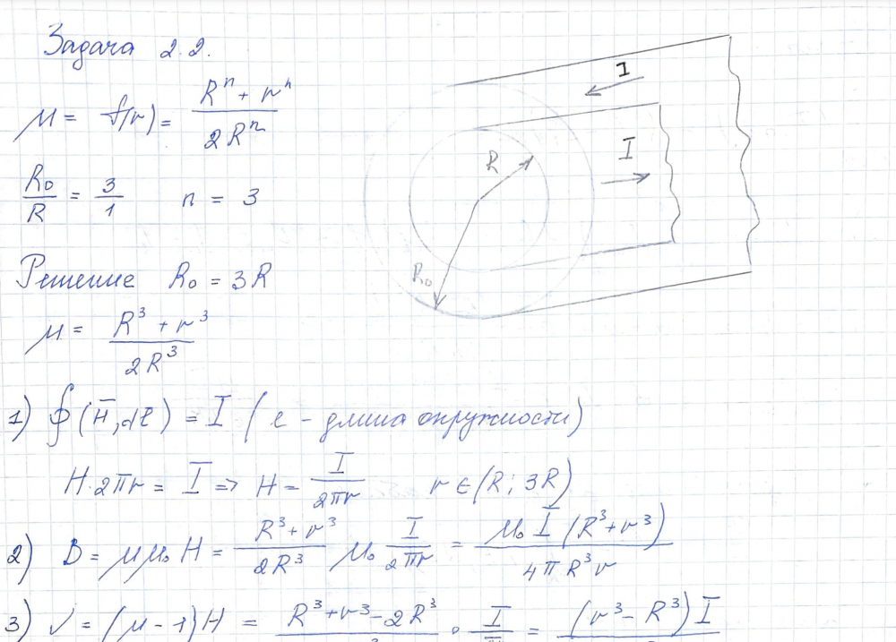 Построить графически распределения модулей векторов индукции B и напряжённости H магнитного поля, а также вектора намагниченности J в зависимости от r в интервале от R до . Определить поверхностную плотность токов намагничивания на внутренней и внешней поверхностях магнетика и распределение объёмной плотности токов намагничивания . Определить индуктивность единицы длины кабеля.