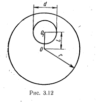 В однородном диске массой m=1 кг и радиусом r=30 см вырезано круглое отверстие диаметром d=20 см, центр которого находится на расстоянии l=15 см от оси диска (рис. 3.12). Найти момент инерции J полученного тела относительно оси, проходящей перпендикулярно плоскости диска через его центр.