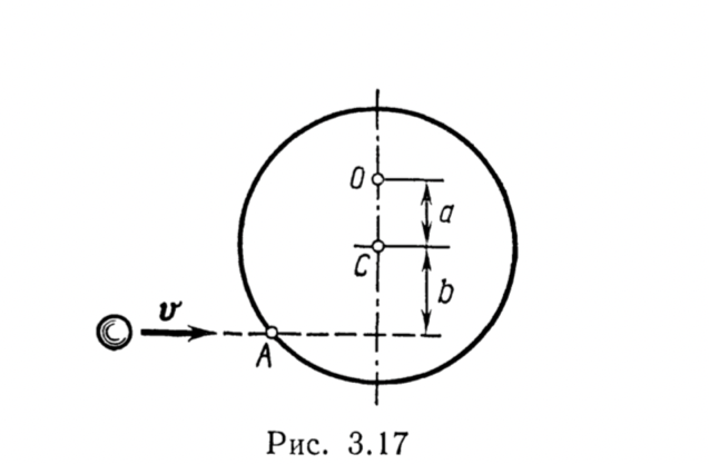 Однородный диск массой m1=0,2 кг и радиусом R=20 см может свободно вращаться вокруг горизонтальной оси z, перпендикулярной плоскости диска и проходящей через точку С (рис. 3.17). В точку А на образующей диска попадает пластилиновый шарик, летящий горизонтально (перпендикулярно оси z) со скоростью v=10 м/с, и прилипает к его поверхности. Масса m2шарика равна 10 г. Определить угловую скорость ω диска и линейную скорость u точки О на диске в начальный момент времени. Вычисления выполнить для следующих значений а и b: 1) a=b=R; 2) a=R/2, b=R; 3) а=2R/3, b=R/2; 4) a=R/3, b=2R/3. ![]()