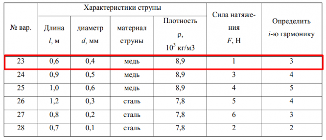 определить частоту колебаний и длину волны i -ой гармоники стоячей волны; для этой гармоники нарисовать вдоль струны качественную картину: а) стоячей волны амплитуд смещений точек струны; б) распределения скоростей точек струны для момента времени t = 0,25T, где T - период колебания струны для i -ой гармоники. Исходные данные для каждого варианта задачи представлены в таблице № 19