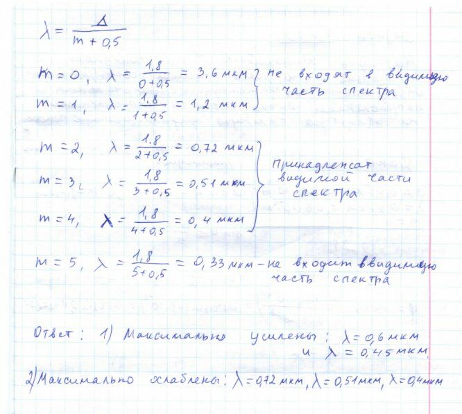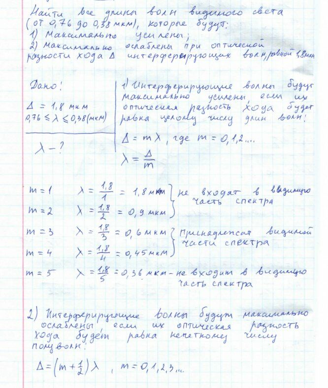 Найти все длины волн видимого света (от 0,76 до 0,38 мкм), которые будут: 1)Максимально усилены; 2)Максимально ослаблены при оптической разности хода Δ интерферирующих волн, равной 1,8 мкм.