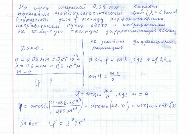 На щель шириной a=0,05 мм падает нормально монохроматический свет (λ=0,6 мкм). Определить угол φ между первоначальным направлением пучка света и направлением на четвертую темную дифракционную полосу.