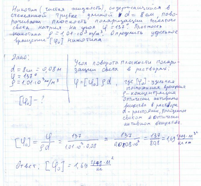 Главная » Учебные материалы » Физика » Решения задач » СКФУ в г. Пятигорск » Несколько классов/семестров » Номер 32 » Вариант 20 » Никотин (чистая жидкость), содержащийся в стеклянной трубке длиной d=8 см, поворачивает плоскость поляризации желтого света натрия на угол φ=137°. Плотность никотина ρ=1,01∙103 кг/м3. Определить удельное вращение [φ0] никотина.