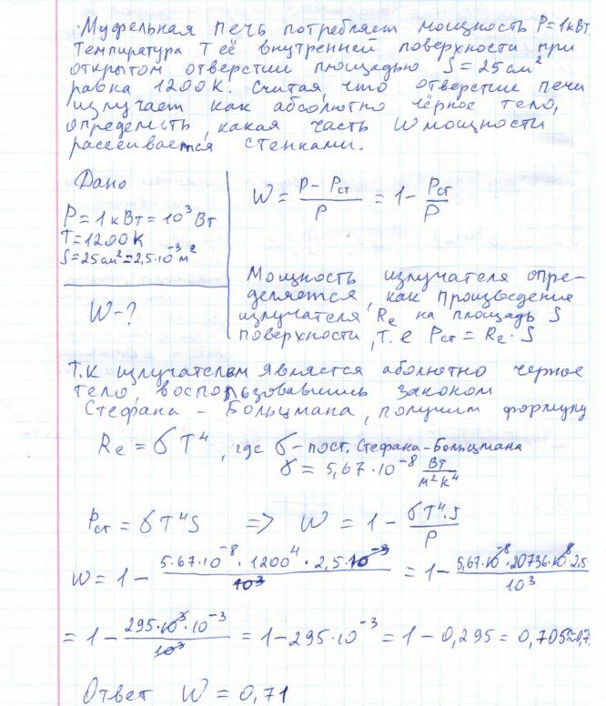 Главная » Учебные материалы » Физика » Решения задач » СКФУ в г. Пятигорск » Несколько классов/семестров » Номер 34 » Вариант 11 » Муфельная печь потребляет мощность Р=1кВт. Температура Т её внутренней поверхности при открытом отверстии площадью S=25 см2 равна 1200 К. Считая, что отверстие печи излучает как чёрное тело, определить, какая часть ω мощности рассеивается стенками.