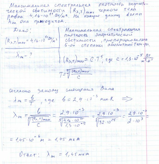 Главная » Учебные материалы » Физика » Решения задач » СКФУ в г. Пятигорск » Несколько классов/семестров » Номер 34 » Вариант 21 » Максимальная спектральная плотность энергетической светимости (Mλ, T)max черного тела равна 4,16∙1011 (Вт/м2)/м. На какую длину волны λm она приходится?