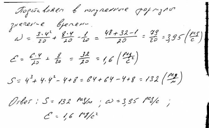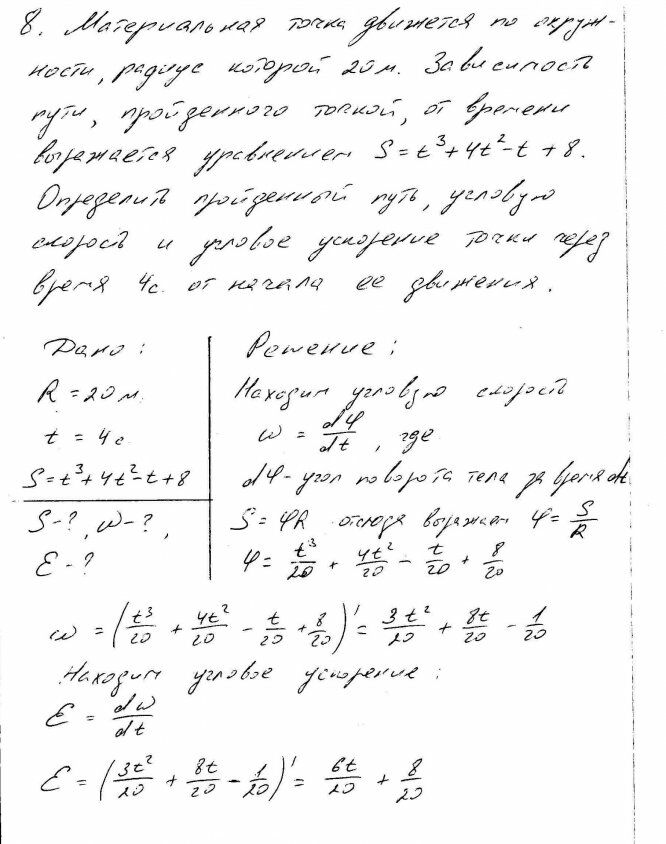 Материальная точка движется по окружности, радиус которой 20 м. Зависимость пути, пройденного точкой, от времени выражается уравнения S=t3+4t2t+8. Определить пройденный путь, угловую скорость и угловое ускорение точки через время 4 с от начала ее движения.