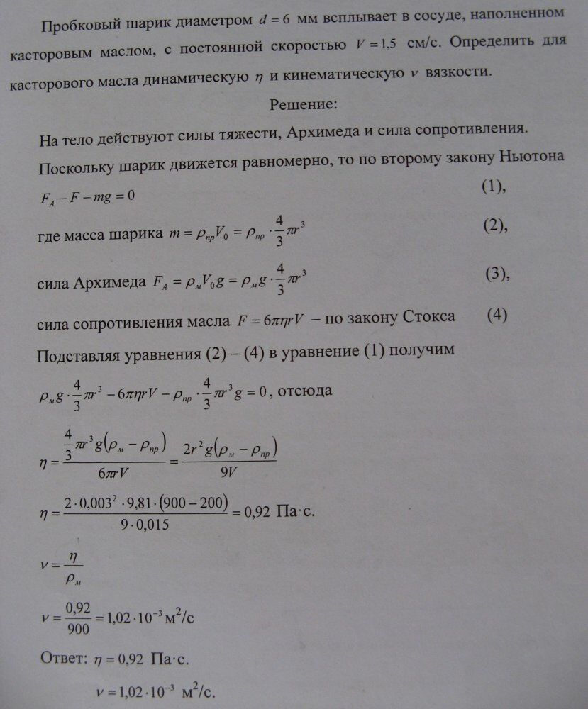 Главная » Учебные материалы » Физика » Решения задач » Несколько классов/семестров » Номер 1 » Вариант 240 » Пробковый шарик (плотность ρ=0,2 г/см3) диаметром d=6 мм всплывает в сосуде, наполненном касторовым маслом (плотность ρ'=0,96 г/см3), с постоянной скоростью υ=1,5 см/с. Определить для касторового масла: 1) динамическую вязкость η; 2) кинетическую вяз