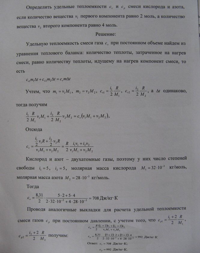 Определить удельную теплоемкость cp смеси кислорода и азота, если количество вещества ν1 первого компонента равно 2 моль, а количество вещества ν2 второго равно 4 моль.
