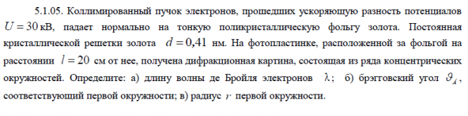 5.1.05. Коллимированный пучок электронов, прошедших ускоряющую разность потенциалов U  30 кВ, падает нормально на тонкую поликристаллическую фольгу золота. Постоянная кристаллической решетки золота d  0,41 нм. На фотопластинке, расположенной за фольгой на расстоянии l  20 см от нее, получена дифракционная картина, состоящая из ряда концентрических окружностей. Определите: а) длину волны де Бройля электронов  ; б) брэгговский угол Á  , соответствующий первой окружности; в) радиус r первой окружности..