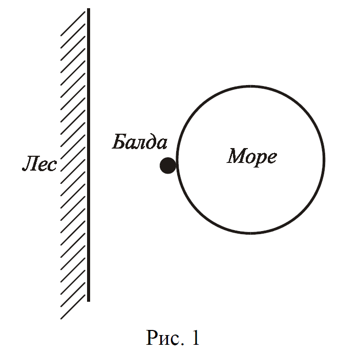 Балда выпустил зайца одновременно с тем, как бесенок побежал “по берегу морскому” (см. рис.1). Заяц побежал по кратчайшему расстоянию, равному 2 верстам, “в лесок до дому” со скоростью 30 верст/час. Возвращаясь, бесенок видел зайца, мелькнувшего за первым
