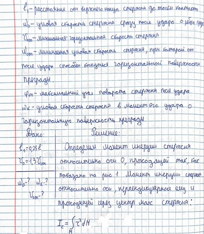 V0m – минимальная горизонтальная скорость стержня, а ω0m – соответственно минимальная угловая скорость стержня, при которой он после удара способен коснуться горизонтальной поверхности преграды;
