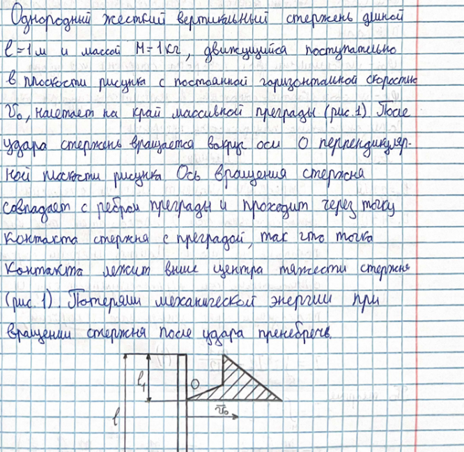 Однородный жёсткий вертикальный стержень длиной l=1 м и М=1 кг, движущийся поступательно в плоскости рисунка с постоянной горизонтальной скоростью V0, налетает на край массивной преграды (рис. 1). После удара стержень вращается вокруг оси O перпендикулярной плоскости рисунка. Ось вращения стержня совпадает с ребром преграды и проходит через точку контакта стержня с преградой, так что точка контакта лежит выше центра тяжести стержня (рис. 14). Потерями механической энергии при вращении стержня после удара пренебречь.