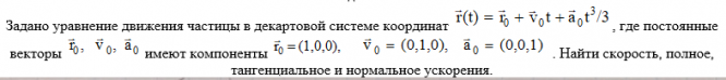 Задано уравнение движения частицы в декартовой системе координат , где постоянные векторы имеют компоненты . Найти скорость, полное, тангенциальное и нормальное ускорения.