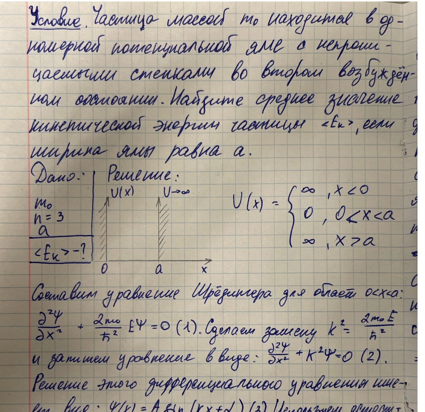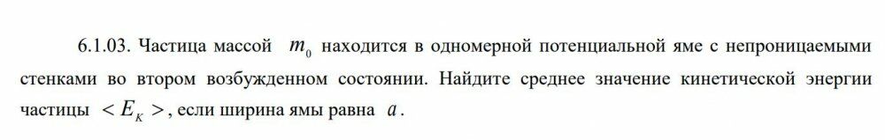 6.1.03. Частица массой m0 находится в одномерной потенциальной яме с непроницаемыми стенками во втором возбужденном состоянии. Найдите среднее значение кинетической энергии частицы  EK  , если ширина ямы равна a .