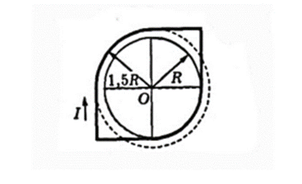 По плоскому контуру из тонкого провода течет ток 1 А. Определите индукцию магнитного поля, создаваемого этим током в точке О. Радиус закругленной части 20 см.