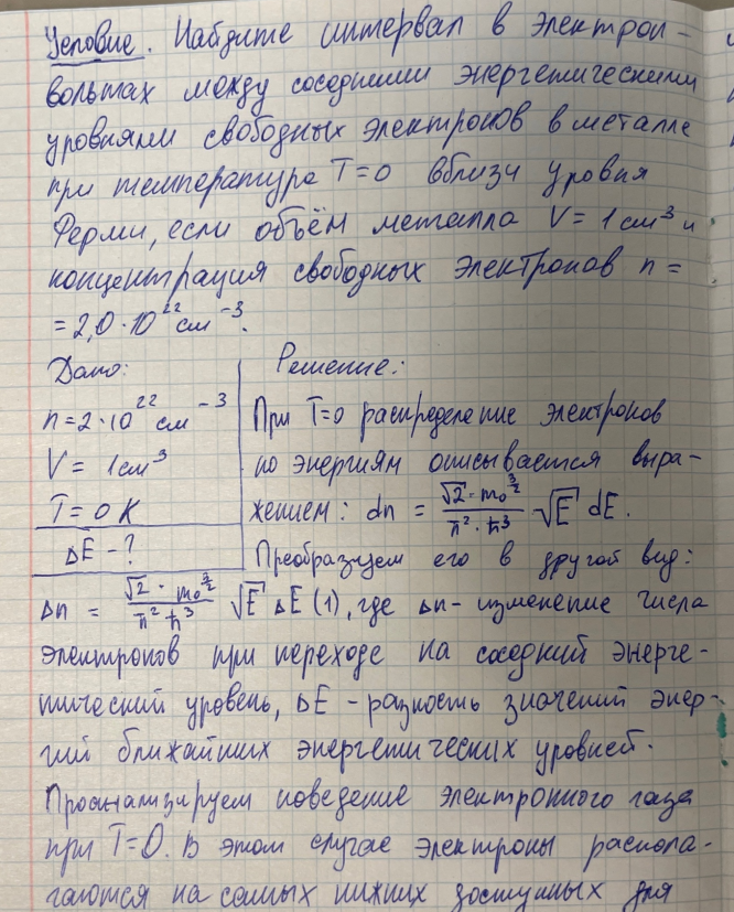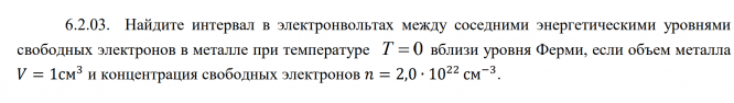 6.2.03. Найдите интервал в электронвольтах между соседними энергетическими уровнями свободных электронов в металле при температуре T 0 вблизи уровня Ферми, если объем металла 𝑉 = 1см3 и концентрация свободных электронов 𝑛 = 2,0 ∙ 1022 см−3 .
