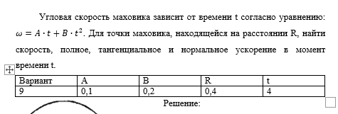 Показать/скрыть дополнительное описаниеУгловая скорость маховика зависит от времени t согласно уравнению: ω=A∙t+B∙t^2. Для точки маховика, находящейся на расстоянии R, найти скорость, полное, тангенциальное и нормальное ускорение в момент времени t..
