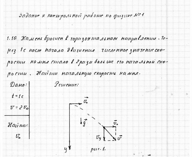 1.10. Камень брошен в горизонтальном направлении. Через 1 с после начала движения численное значение скорости камня стало в 2 раза больше его начальной скорости. Найти начальную скорость камня.