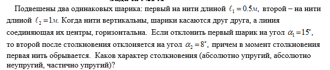 Подвешены два одинаковых шарика: первый на нити длиной второй – на нити длиной Когда нити вертикальны, шарики касаются друг друга, а линия соединяющая их центры, горизонтальна. Если отклонить первый шарик на угол то второй после столкновения отклоняется на угол причем в момент столкновения первая нить обрывается. Каков характер столкновения (абсолютно упругий, абсолютно неупругий, частично упругий)?