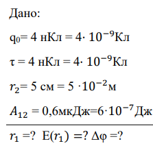 Заряд 𝑞0 находится в поле бесконечно длинной заряженной нити с линейной плотностью заряда на ней τ. При перемещении заряда 𝑞0 из точки, отстоящей на расстоянии 𝑟1 от нити в точку на расстояние 𝑟2 от нити, совершается работа 𝐴12. ∆ϕ – разность потенциалов между точками, Е(𝑟1) – напряжённость поля на расстоянии 𝑟1. Используя данные таблицы 2.2, найдите недостающие величины