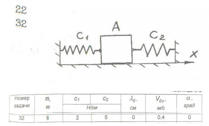 Найти уравнения движения груза А массой m кг, отнеся его движение к оси Ох. Ось Ох направлена в противоположную сторону от показанной на рисунке. Определить амплитуду, круговую частоту и период колебаний груза А, если с1 и с2 – коэффициенты жесткости пружин, α – угол наклона плоскости к горизонту, λ0 – начальная деформация пружин из положения статического равновесия, V0x –проекция начальной скорости груза А на ось Ох. Весом пружин и трением груза А о плоскость пренебречь.