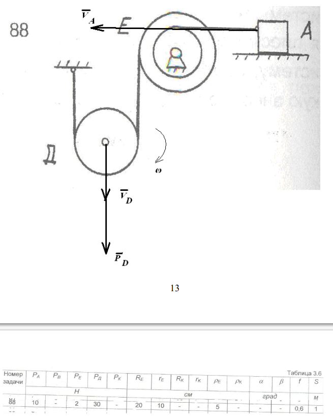 Механическая система, состоящая из нескольких тел, приходит в движение из состояния покоя. Учитывая трение скольжения тел о плоскости и пренебрегая другими сопротивлениями, а также считая нити невесомыми и нерастяжимыми, определить скорость тела А, когда оно совершит перемещение S. Определить направление движения тела А там, где это не очевидно из условия, а также ускорение тела А. При решении задачи,если нет дополнительных данных, блоки Е считать однородными круглыми цилиндрами, а массы колес D, K — распределенными по ободам. Колеса катятся без скольжения, В задачах приняты следующие обозначения: Ра, Рв, РE, … - силы тяжести тел А, В, Е и т.д., RE, rE, Rk, rK - радиусы больших и малых окружностей; ρE ρK - радиусы инерции тел Е, К и т.д. относительно горизонтальных осей. проходящих через центр масс, α, β -углы наклона плоскостей к горизонту; f - коэффициент трения тела А о плоскость.