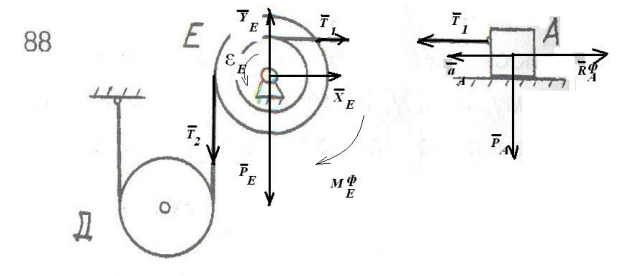 Главная » Учебные материалы » Физика » Решения задач » Используя условия задач 81-100, а также значение найденного ускорения аA, , определить натяжение всех ветвей нитей и реакцию блока Е.