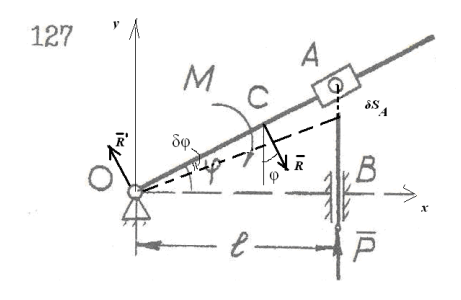 В кулисном механизме при качании рычага ОС вокруг горизонтальной оси О ползун А, перемещаясь вдоль рычага ОС, приводит в движение стержень АВ, движущийся в вертикальных направляющих В. Даны размеры: OA=R=40см, l=20см, φ= 30°. Какую пару сил М надо приложить к кривошипу ОС для того, чтобы уравновесить силу Р=10Н, направленную вдоль стержня АВ вверх?