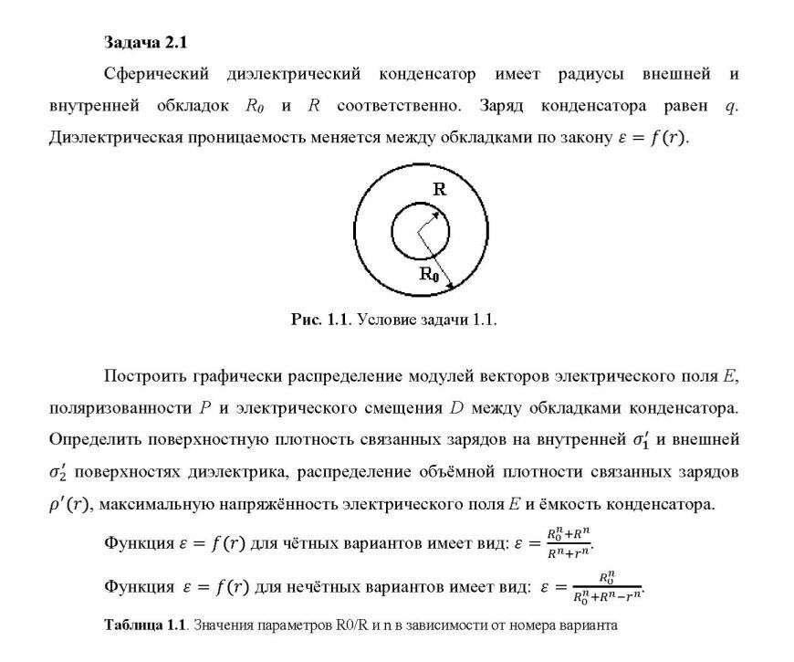 Построить графически распределение модулей векторов электрического поля Е, поляризованности Р и электрического смещения D между обкладками конденсатора. Определить поверхностную плотность связанных зарядов на внутренней σ1’ и внешней σ2’ поверхностях диэлектрика, распределение объёмной плотности связанных зарядов ρ’(r), максимальную напряженность электрического поля Е и ёмкость конденсатора. ԑ=f(r) имеет вид ε=(R_0^n)/(R_0^n+R^n-r^n ) R0 /R=3/2, n = 2