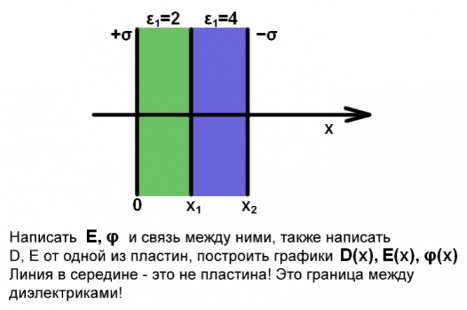 Написать и связь между ними, также написать D, Е от одной из пластин, построить графики D(x), E(x), Ф(х). Линия в середине — это не пластина! Это граница между диэлектриками!