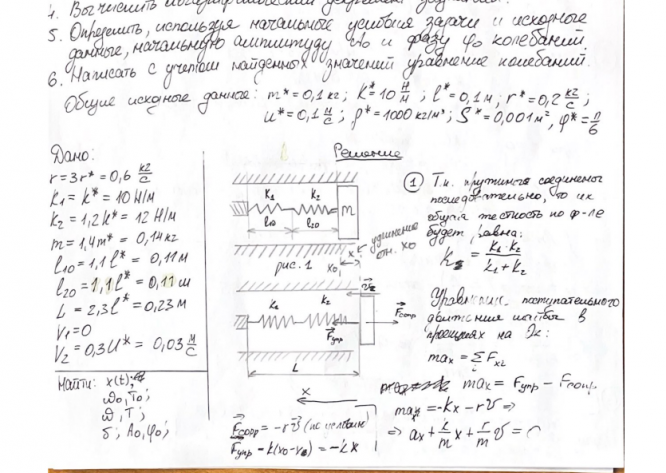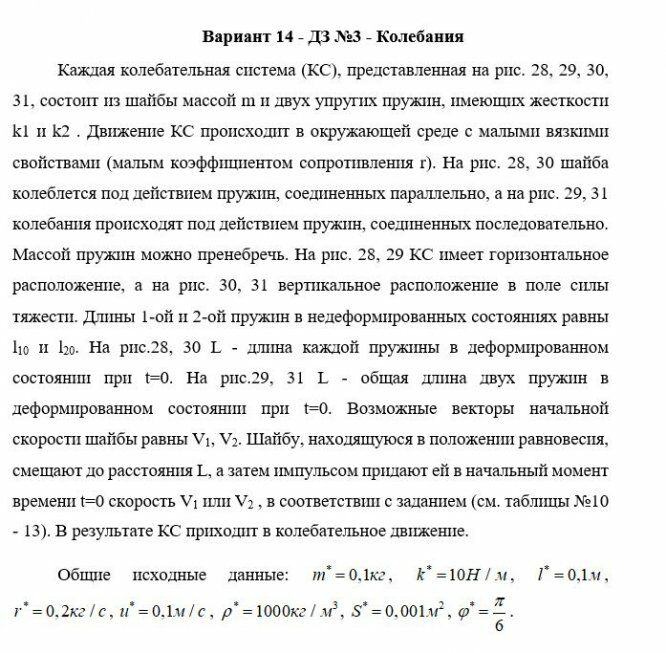 Каждая колебательная система (КС), представленная на рис. 28, 29, 30, 31, состоит из шайбы массой m и двух упругих пружин, имеющих жесткости k1 и k2 . Движение КС происходит в окружающей среде с малыми вязкими свойствами (малым коэффициентом сопротивления r). На рис. 28, 30 шайба колеблется под действием пружин, соединенных параллельно, а на рис. 29, 31 колебания происходят под действием пружин, соединенных последовательно. Массой пружин можно пренебречь. На рис. 28, 29 КС имеет горизонтальное расположение, а на рис. 30, 31 вертикальное расположение в поле силы тяжести. Длины 1-ой и 2-ой пружин в недеформированных состояниях равны l10 и l20. На рис.28, 30 L - длина каждой пружины в деформированном состоянии при t=0. На рис.29, 31 L - общая длина двух пружин в деформированном состоянии при t=0. Возможные векторы начальной скорости шайбы равны V1, V2. Шайбу, находящуюся в положении равновесия, смещают до расстояния L, а затем импульсом придают ей в начальный момент времени t=0 скорость V1 или V2 , в соответствии с заданием (см. таблицы №10 - 13). В результате КС приходит в колебательное движение.