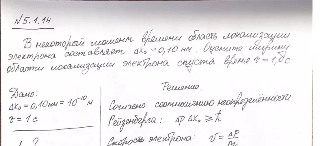 В некоторый момент времени область локализации электрона составляет Δx0 = 0,10 нм. Оцените ширину области локализации электрона спустя время т=1,0 с