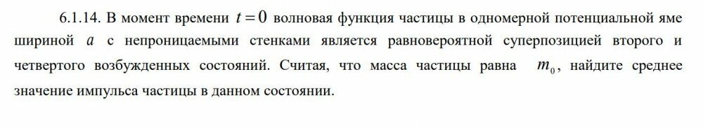 6.1.14. В момент времени t  0 волновая функция частицы в одномерной потенциальной яме шириной a с непроницаемыми стенками является равновероятной суперпозицией второго и четвертого возбужденных состояний. Считая, что масса частицы равна m0 , найдите среднее значение импул