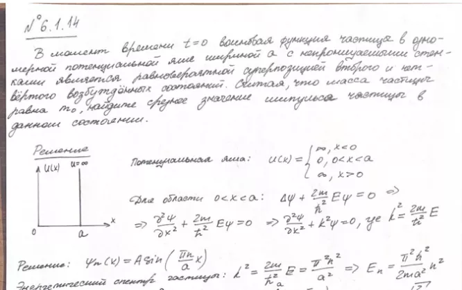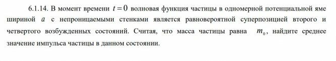 6.1.14. В момент времени t 0 волновая функция частицы в одномерной потенциальной яме шириной a с непроницаемыми стенками является равновероятной суперпозицией второго и четвертого возбужденных состояний. Считая, что масса частицы равна m0 , найдите среднее значение импул