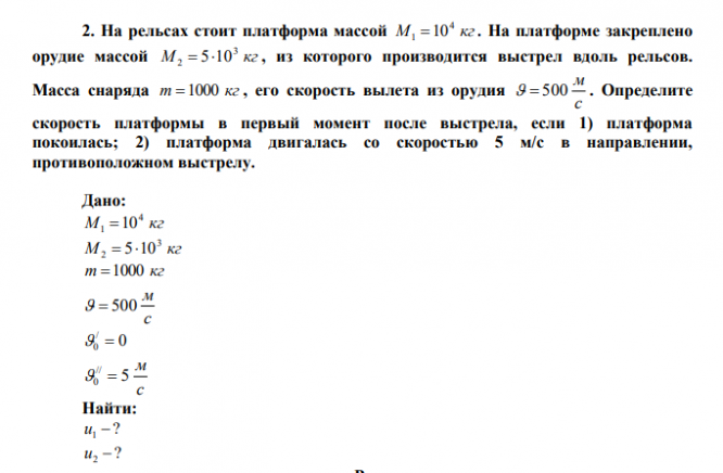 На рельсах стоит платформа массой M. На платформе закреплено орудие массой M кг, из которого производится выстрел вдоль рельсов. Масса снаряда m 1000 кг , его скорость вылета из орудия с. Определите скорость платформы в первый момент после выстрела, если 1) платформа покоилась; 2) платформа двигалась со скоростью 5 м/с в направлении, противоположном выстрелу