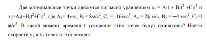 Две материальные точки движутся согласно уравнениям х1 = А1t + B1t 2 + C1t 3 и x2 = A2t + B2t 2 + C2t 3, где А1 = 4 м/c, В1 = 8 м/c2, C1 = -16 м/с3, А2 = 2k м/c, B2 = -4 м/c2, C2 = l м/c3. B какой момент времени t ускорения этих точек будут одинаковы? Найти скорости v1 и v2 точек в этот момент.