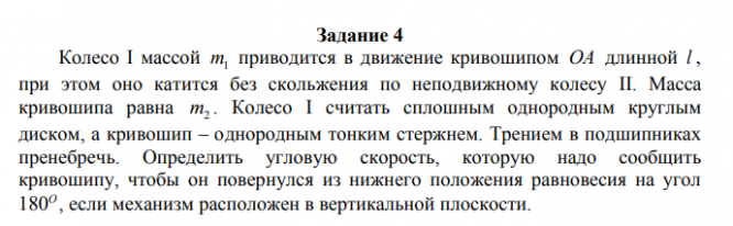 Колесо I массой m1 приводится в движение кривошипом OA длинной l , при этом оно катится без скольжения по неподвижному колесу II. Масса кривошипа равна m2 . Колесо I считать сплошным однородным круглым диском, а кривошип – однородным тонким стержнем. Трением в подшипниках пренебречь. Определить угловую скорость, которую надо сообщить кривошипу, чтобы он повернулся из нижнего положения равновесия на угол 180O , если механизм расположен в вертикальной плоскости.