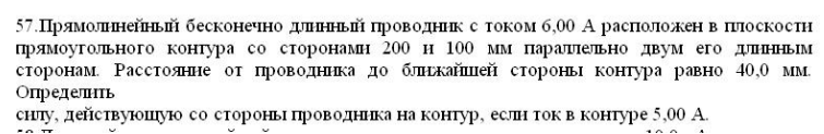 Прямолинейный бесконечно длинный проводник с током 6,00 А расположен в плоскости прямоугольного контура со сторонами 200 и 100 мм параллельно двум его длинным сторонам. Расстояние от проводника до ближайшей стороны контура равно 40,0 мм. Определить силу, действующую со стороны проводника на контур, если ток в контуре 5,00 А.