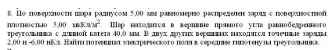 По поверхности шара радиусом 5,00 мм равномерно распределен заряд с поверхностной плотностью 5,00 мкКл/м2. Шар находится в вершине прямого угла равнобедренного треугольника с длиной катета 40,0 мм. В двух других вершинах находятся точечные заряды 2,00 нКл и -6,00 нКл. Найти потенциал электрического поля в середине гипотенузы треугольника.