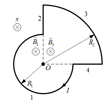 Провод, расположенный в вакууме, по которому течет ток I=10 А, изогнут как показано на рисунке, где R1=20 см, R2=50 см, φ=90º. Найти индукцию магнитного поля в точке O. Ток течет по часовой стрелке.