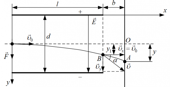 Пластины плоского конденсатора, заряженного до напряжения U=200 В, расположены горизонтально. Длина пластин равна l=13 см, расстояние между ними d. В конденсатор параллельно пластинами влетает со скоростью υ0 ускоренная разностью потенциалов Δφ=130 В из состояния покоя заряженная частица массой m=14·10-6 кг и зарядом q=3·10-9 Кл. Частица вылетает из конденсатора со скоростью υ, направленной под углом α к горизонту, и затем попадает в точке A на экране, расположенном на расстоянии b=52 см. Расстояние между точками O и A равно y=69 мм. Определить d и υ.