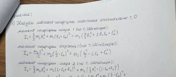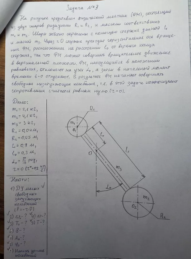 На рис. 11 представлен физический маятник (ФМ), состоящий из двух шаров радиусами R1 и R2, и массами соответственно m1 и m2. Шары жёстко скреплены с помощью стержня длиной L и массой m3. Через т. О стержня проходит горизонтальная ось вращения ФМ, расположенная на расстоянии l0 от верхнего конца стержня, так что ФМ может совершать вращательное движение в вертикальной плоскости. ФМ, находящийся в положении равновесия, отклоняют на угол α0 (см. таблицу № 15), а затем в начальный момент времени t=0 отпускают. В результате ФМ начинает совершать свободные незатухающие колебания, т.е. в этой задаче коэффициент сопротивления считается равным нулю (r=0).
