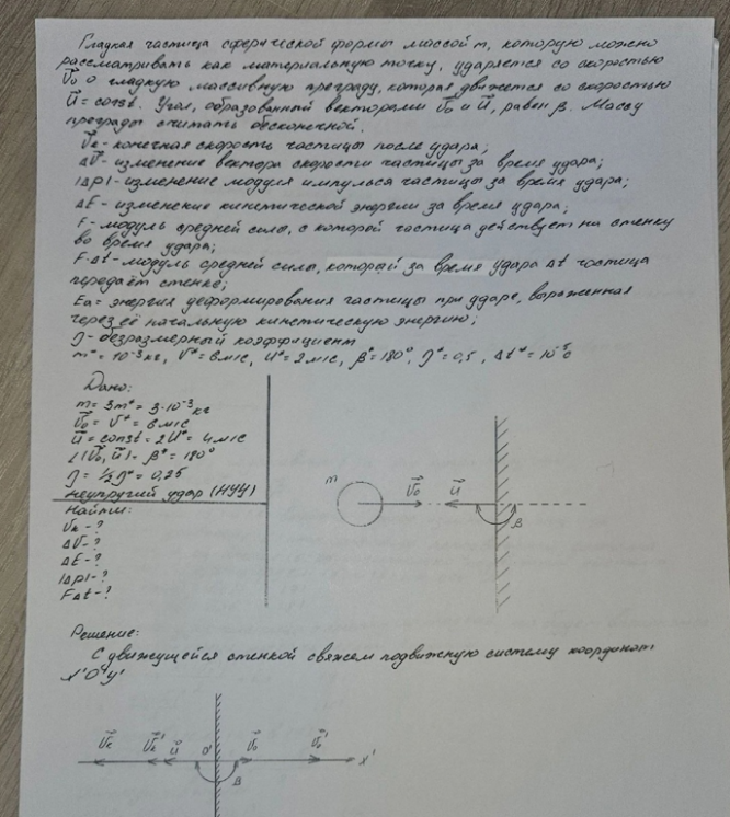 Условие:Гладкая частица сферической формы массой m, которую можно рассматривать как материальную точку, ударяется со скоростью о гладкую массивную преграду, которая движется со скоростью . Угол, образованный векторами и , равен . Массу преграды считать бесконечной. На рис. 5, 6 преграда имеет форму плоской стенки, на рис.7 – форму острого конуса с углом раствора γ, а на рис. 8 – форму конуса сферической головной частью радиусом R. Удар частицы о сферическую поверхность происходит в точке А, расположенной под углом γ относительно оси преграды. При этом АО = R.Виды взаимодействия:а) абсолютно упругий удар (АУУ);