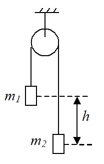 Для студентов ИГЭУ им. Ленина по предмету ФизикаЧерез блок перекинута нить, к концам которой привязаны два груза массами m1 = 1 кг, m2 = 2 кг. Центры масс грузов находятся на расстоянии h = 1 м другЧерез блок перекинута нить, к концам которой привязаны два груза массами m1 = 1 кг, m2 = 2 кг. Центры масс грузов находятся на расстоянии h = 1 м друг
